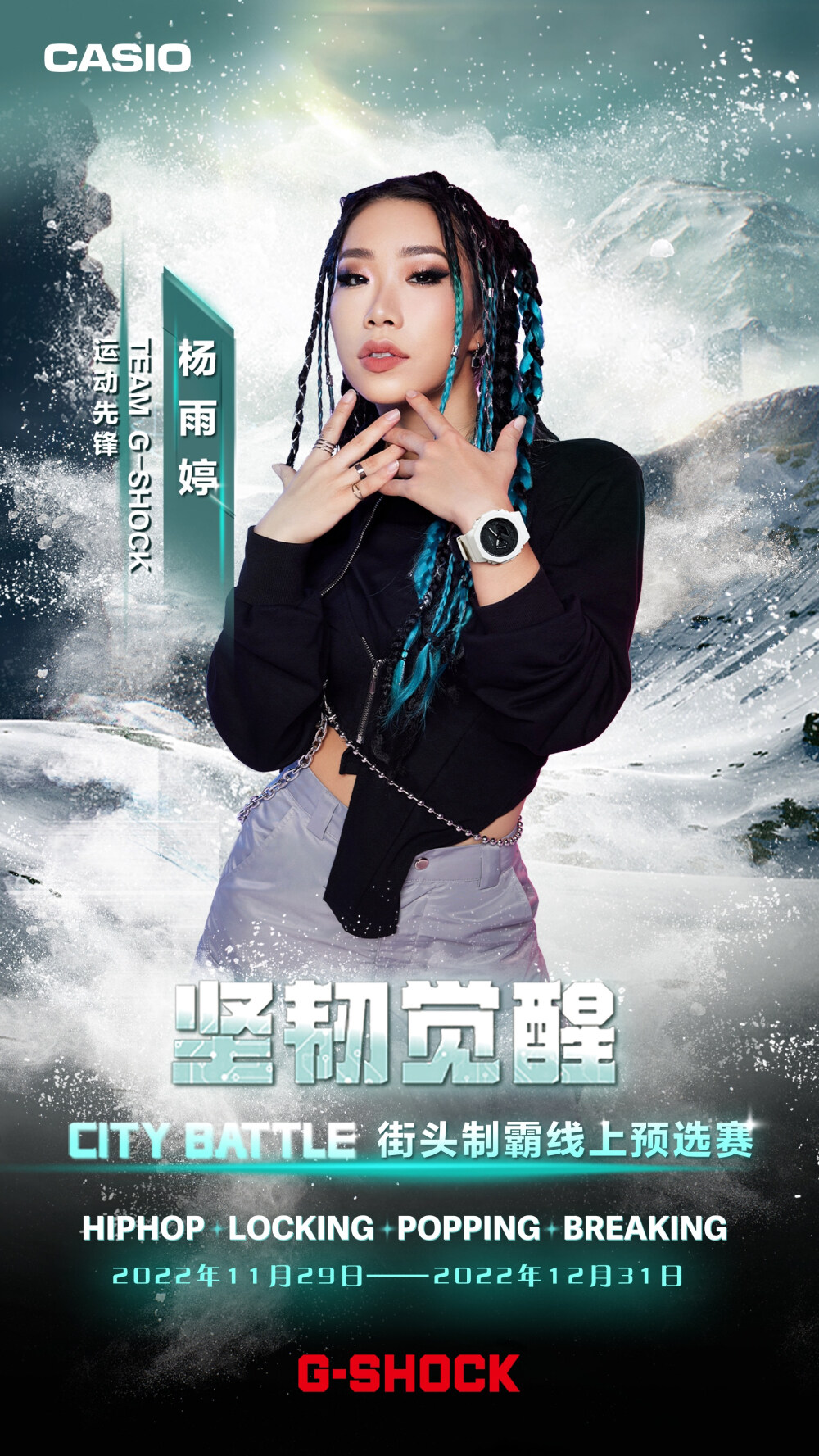 11月29日-12月31日,可通过G-SHOCK抖音官方(卡西欧手表)活动页参与线上挑战赛,用你的舞步彰示你的热爱!四位明星导师将根据线上参与者的热情演绎,选出8强出征CITY BATTLE总决赛。于此同时,线下对抗赛也将开启四场激烈对决,并由明星导师选出各场4强选手,组成线下16强。其中,在各场Battle中斩获冠军的选手将直接晋级决赛,而剩余的12名选手并非直接淘汰,而是仍将有机会获得最终晋级名额。12月27日-12月31日,G-SHOCK 将为12名选手开启复活投票通道,登陆「G-SHOCK WORLD」微信小程序为你喜爱的选手投票,就有机会见证他逆风翻盘!得票数最高的4名选手即复活成功,获得总决赛参赛资格,晋级名单将于12月31日在G-SHOCK官方账号公布!